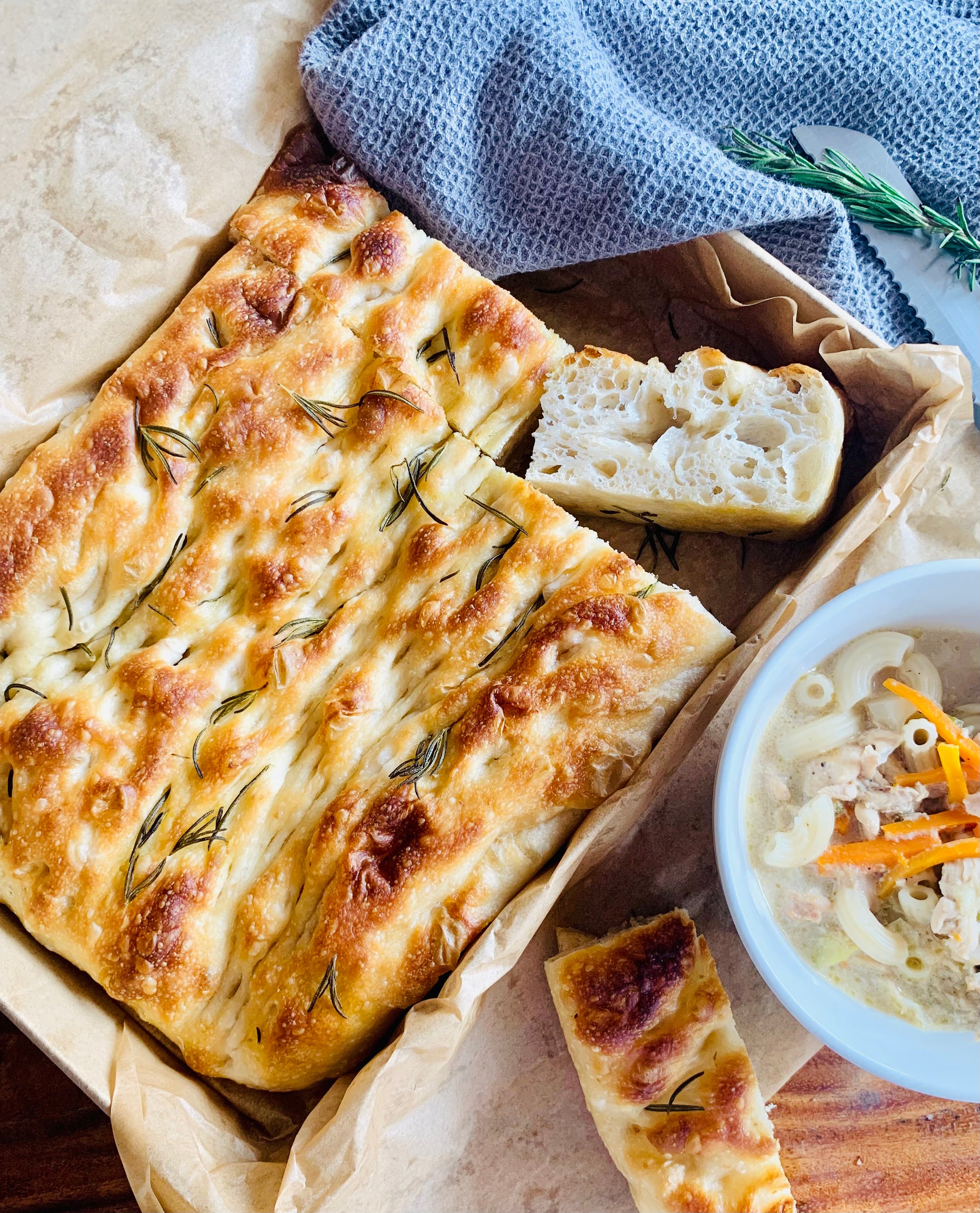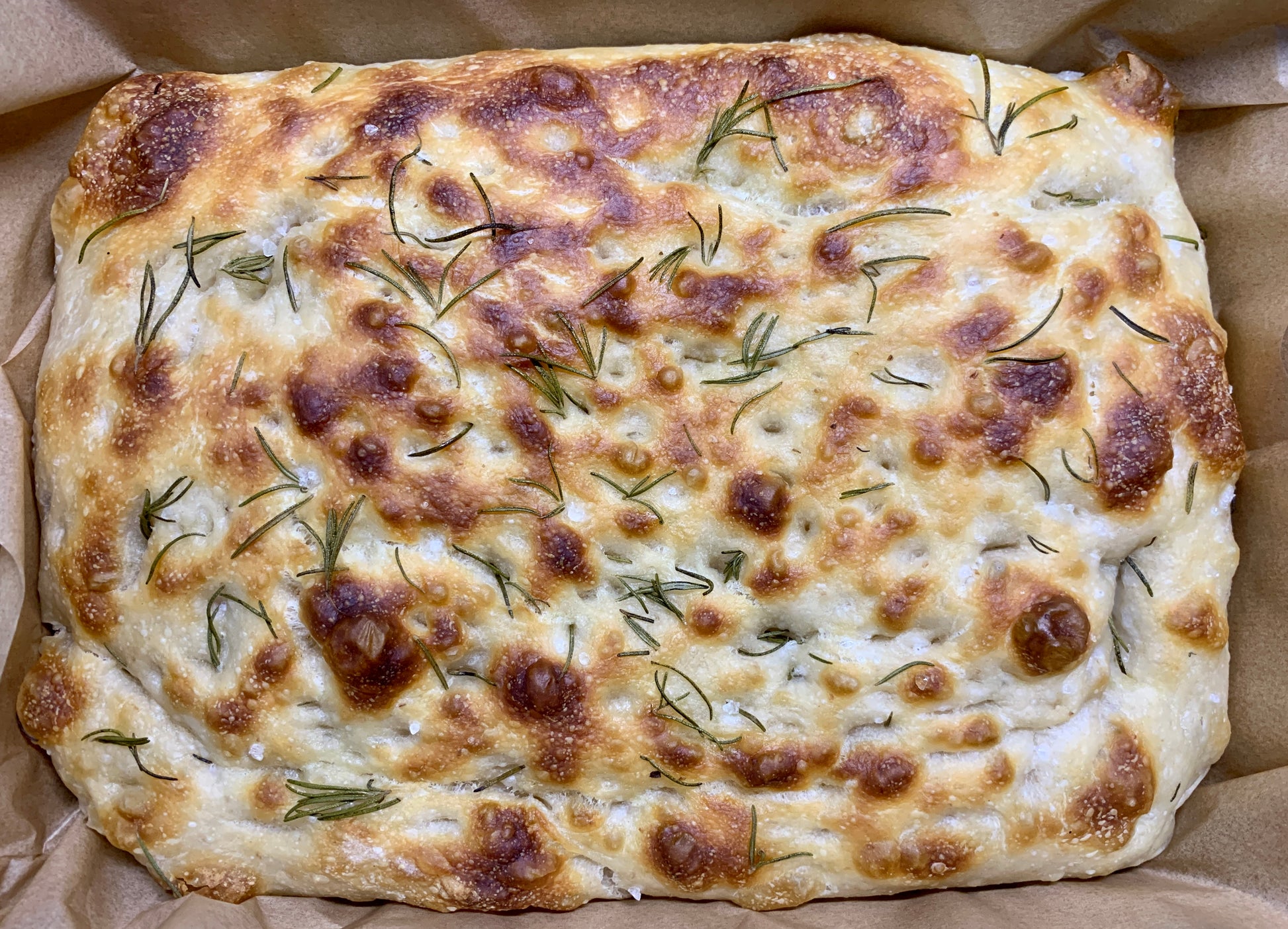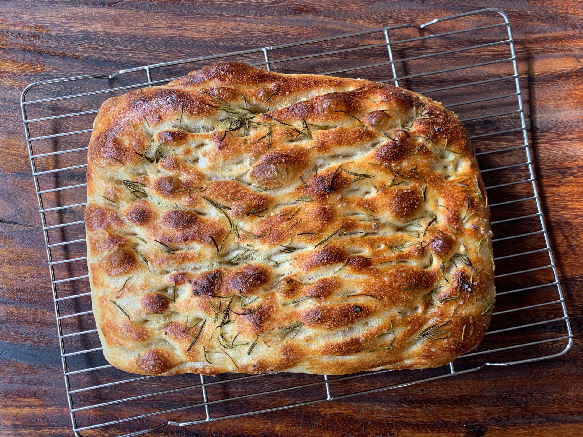 Baked fresh weekly using 512g of bread flour at 82% hydration, this loaf rises slowly to develop its soft, airy crumb and subtle depth of flavor. After bulk fermentation, each focaccia is gently hand-dimpled with olive oil and generously topped with rock salt and fragrant rosemary.