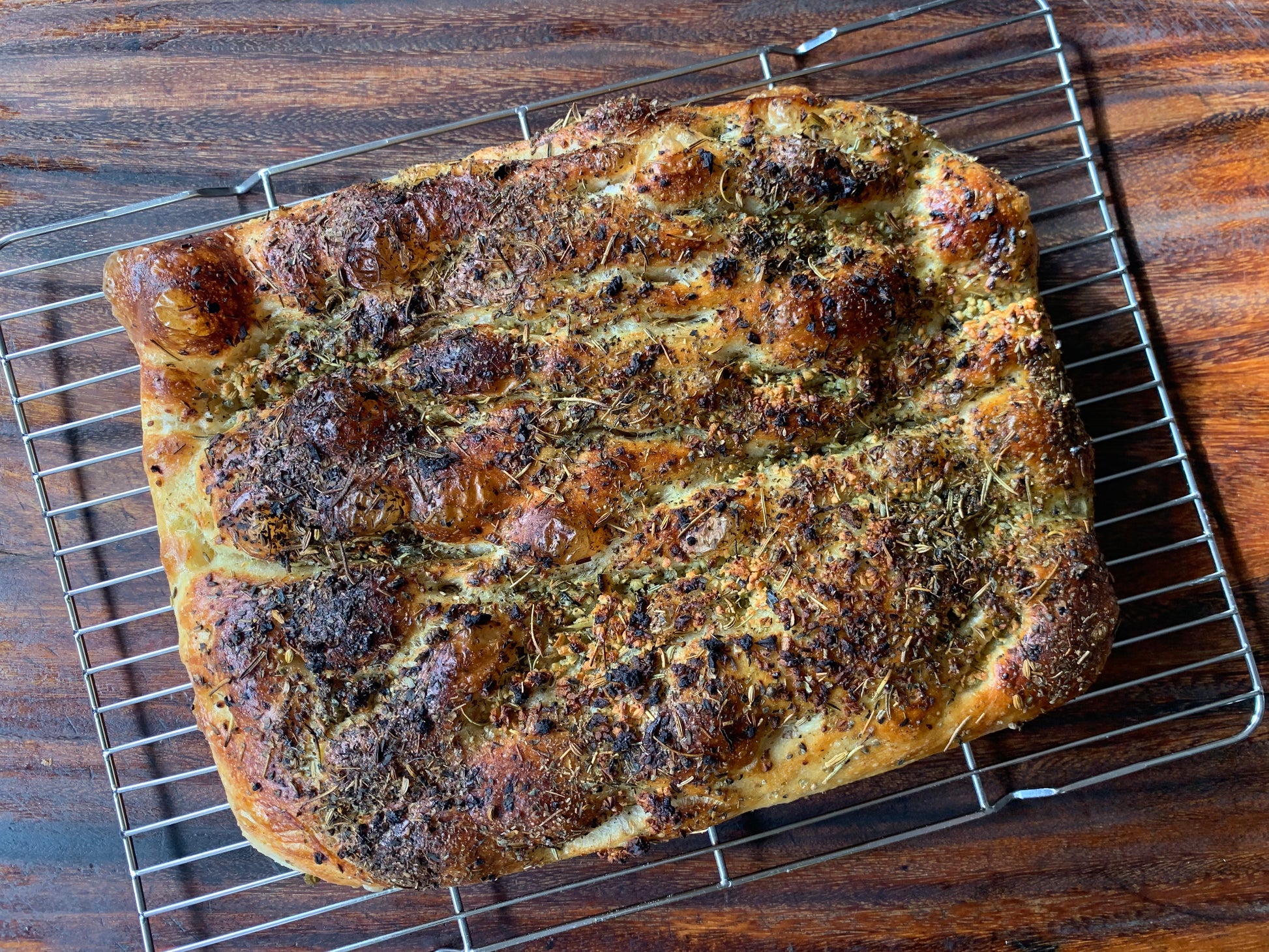 Baked fresh weekly using 512g of bread flour at 82% hydration, this naturally leavened sourdough bread undergoes a slow fermentation process for a more complex taste and airy texture. After its bulk rise, the dough is hand-dimpled with olive oil and generously topped with rock salt, fresh garlic, and aromatic herbs.